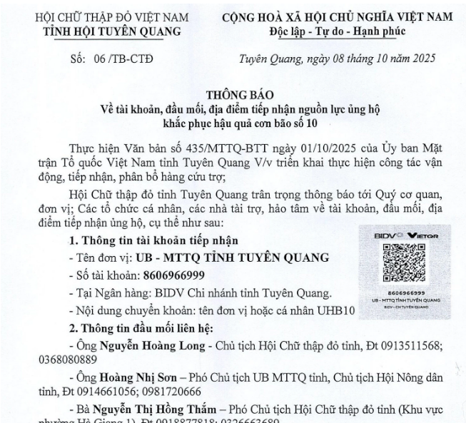 Thực hiện Văn bản số 435/MTTQ-BTT ngày 01/10/2025 của Ủy ban Mặt trận Tổ quốc Việt Nam tỉnh Tuyên Quang về việc triển khai công tác vận động, tiếp nhận, phân bổ hàng cứu trợ, Hội Chữ thập đỏ tỉnh Tuyên Quang vừa có Thông báo số 06/TB-CTĐ ngày 08/10/2025 về tài khoản, đầu mối và địa điểm tiếp nhận nguồn lực ủng hộ khắc phục hậu quả cơn bão số 10.